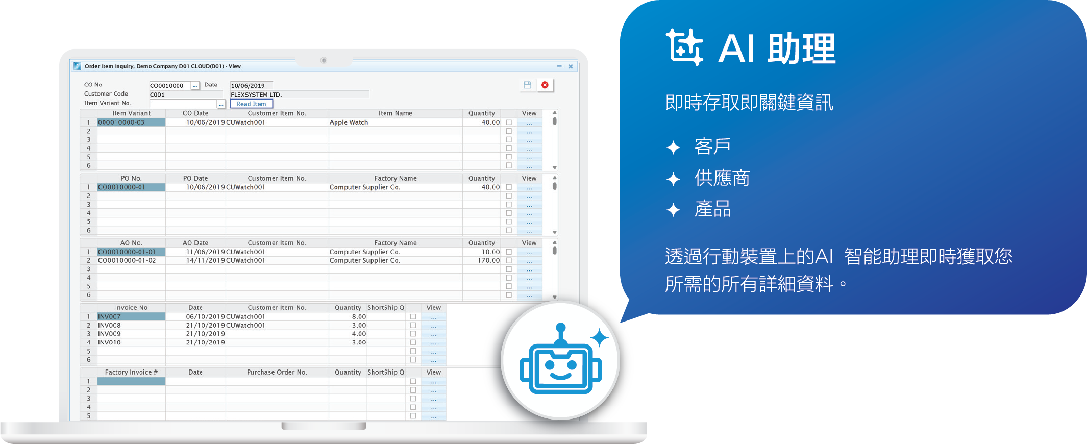 AI 助理:用於透過行動裝置存取有關客戶、供應商和產品的關鍵資訊的聊天機器人。